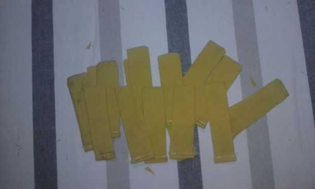 Esta tela es más como una cinta de (30 mm ancho) que usted hará. Primero simplemente coserlo junto con el espacio adicional que usted vuelta adentro hacia fuera. Cortar 16 piezas con una longitud de 100 mm. coser los extremos cerrados.