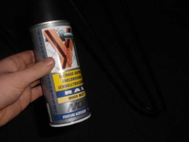 Después de limpiar las barras que estén listos para rociar, usé un Ral 9005 mate lata de aerosol negro. Colgar las barras a una cuerda o algo así que son fáciles de pulverizar.