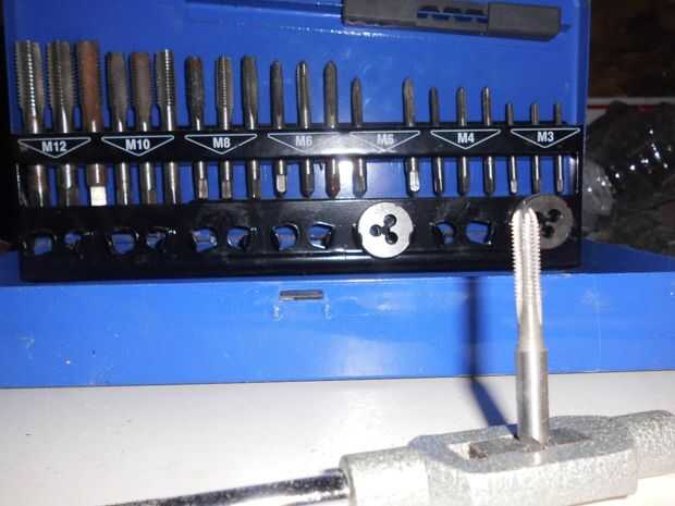 Para hacer la rosca de tornillo de madera necesita un rosca conjunto. Use un taladro de la cabeza del tornillo (M5) en los agujeros que hicimos en el lado de la madera. Se perforaron los agujeros de un tamaño más pequeño (Ø 4,5 mm) para posibilitar el corte de hilo en el agujero.