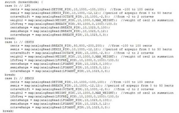 Para ello que mantenga presionados los botones de selección de oscilador rojo 2 y pulse uno de los botones de la 8 tapa. En el código fuente de bucles mientras mantienes los botones, que metal es el pulsador de la lectura y ajuste variable (breathMode) al número seleccionado. Luego elige la configuración con una instrucción switch/case. Se hace fuerza un poco bruta, pero tenía un montón de la izquierda de la memoria para el código así que no tenía sentido que demasiado lujo.