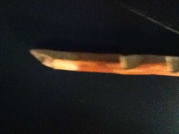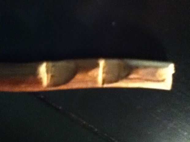 (abajo). Para hacer que usted necesita cortar una línea en el palillo, cortar hasta que corte en la línea de corte, etc.. Gradualmente los "agujeros de la flauta" sobre 1/4-1/2 del ancho del palo. También puede Agregar y otro adicional para el dedo pulgar entre el primer y el segundo agujero. Para hacer la boquilla, sólo corte en un ángulo de 45 grados hasta que lo tienes tan profundo como quieras.
