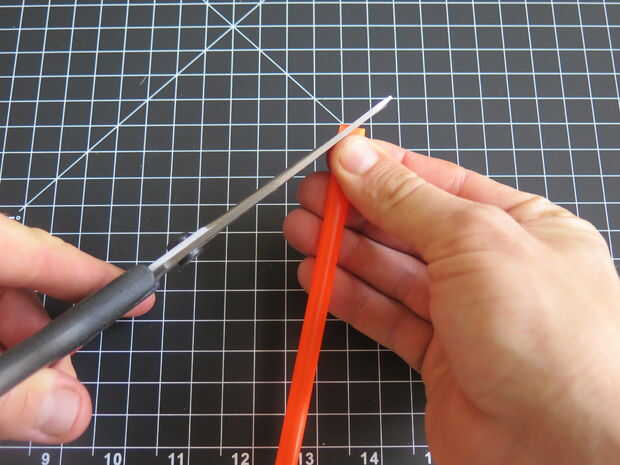 Cortar un extremo de la paja a un punto. Comience apretando un extremo con los dedos, y luego corte dos cortes angulares para obtener un triángulo.