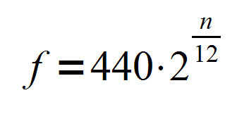 Ya que es demasiado genérico diciendo: "Quiero jugar una E", hay que especificar también la octava. En mi caso la primera C es un C4 y el último es un C5. Por ello A un A4, con una frecuencia definida como 440 Hz (tono de concierto moderno). De esto podemos determinar todas las demás frecuencias utilizando la fórmula de segunda (segunda foto, obviamente). El n es el número de semitonos entre la nota que queremos y la A4. Si la nota es menor que n será negativo, si la nota es superior será positivo.