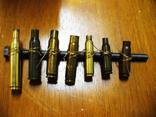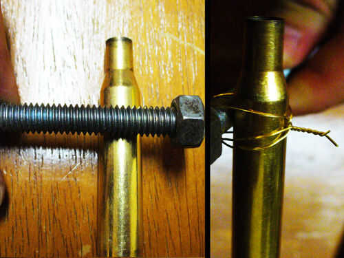 Primero corte una longitud de alambre de unos 20-30 pulgadas de largo (globo ocular). Luego coloque su cubierta de bala contra la varilla e iniciar bucle el cable alrededor de ambas piezas en un patrón entrecruzado. Si vas para el 'rough' mirada como la mía entonces no te preocupes ser perfecto. Una vez que tienes suficientes lazos alrededor de él tuerza los dos extremos como una ligadura en una hogaza de pan. Si desea que puede usar cortadores de alambre para cortar el extra, mina salí tratando de conseguir un look de alambre de púas.
