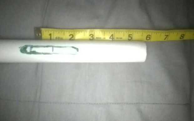 Tomar su en 19 pieza de tubería y corte dibujar una línea marcando el punto donde se corte el tubo en dos. Próximo sorteo un óvalo donde se cincele el agujero de sonido la forma más fácil de hacerlo es marcar dos líneas más, uno será en 1 1/2 de la primera línea esto se dibujará en el lado más largo, y la segunda línea será 1 en de la original línea y estará en el lado más corto.