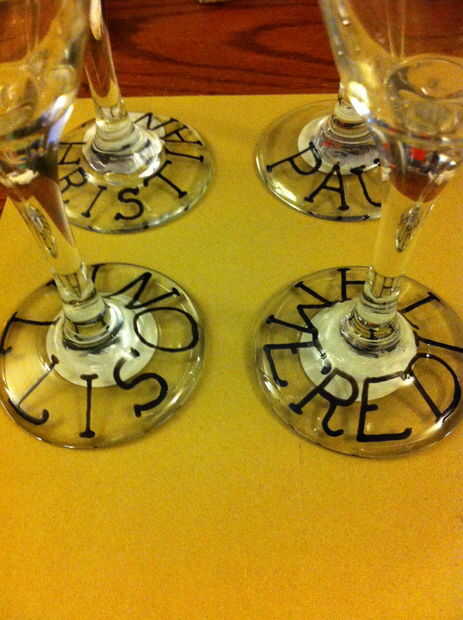 Dividir el presupuesto a la mitad. Escriba la primera mitad de la cita en la parte trasera de una nota pegajosa lo que gustaría ver en la primera flauta y pegarlo en el interior de una flauta por lo que se pueden trazar las letras sobre el cristal. Hacer lo mismo con la segunda mitad de la cita y dejar que las flautas de aire seco.