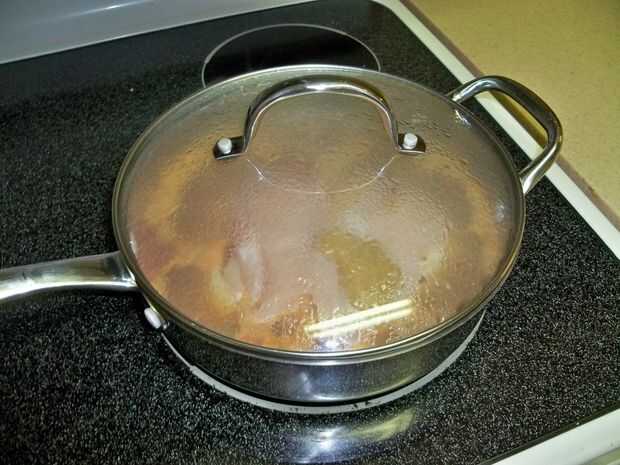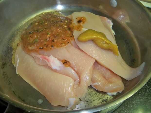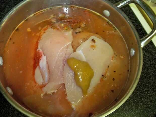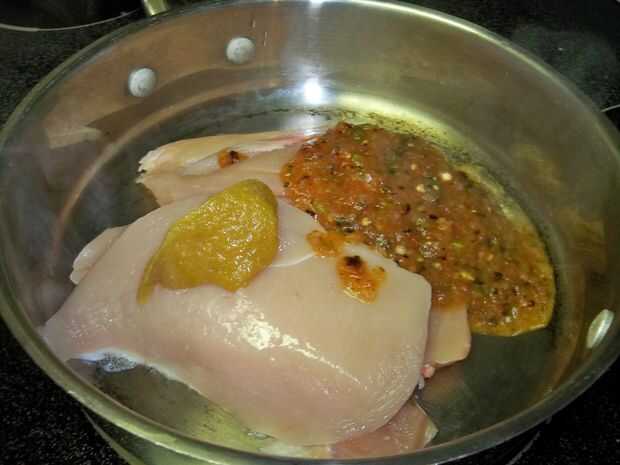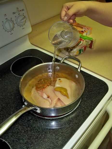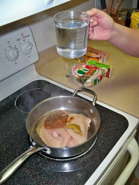 En una olla mediana con tapa, añadir la pechuga de pollo, base de pollo, pimentón, salsa y 2 tazas de agua (o suficiente para casi cubrir el pollo). Estofado lentamente a fuego medio durante aproximadamente una hora y media o hasta que los trozos de pollo apartes fácilmente con un tenedor.