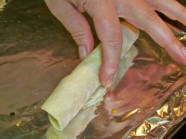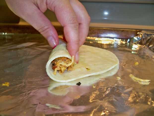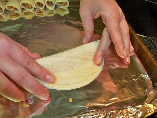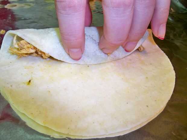 Coloque una tortilla en un plato. Agregue aproximadamente una y media cucharadas de relleno en el centro de la concha de tortilla. Propagación longitudinal a través del centro. Doble la tortilla sobre el pollo y lisa hasta su tenso, enrollo deje la costura hacia abajo. Incluimos un vídeo demostración de este proceso, como puede ser algo complicado.