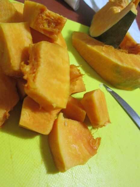 Pelar cuidadosamente las cuñas de la calabaza y cortar en grandes rectángulos o cuadrados