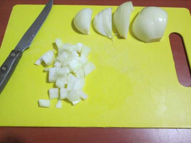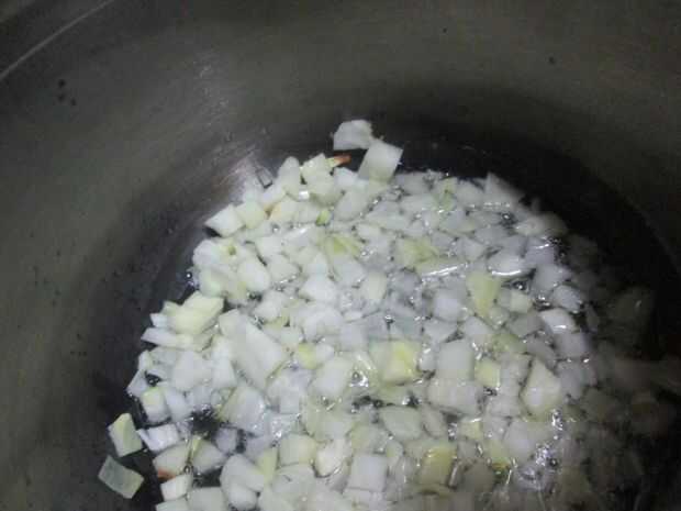 Cortar la cebolla en trozos medianos, ponerlo en la cacerola y cocine durante 2-3 minutos hasta que blanda pero no dorada.