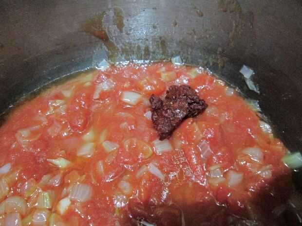 Agregue comprados tomates y pasta de ají picante, mezcle muy bien todo