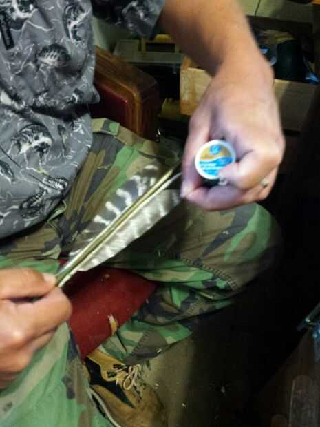 Una vez que las dos plumas en la alineación apropiada con el nock, puede comenzar a "peluquero poling" el hilo de rosca dentro de la pluma. Asegúrese de que los ajustes de la secuencia hacia abajo dentro de las plumas y proceden a la pluma del espaciado del hilo hacia fuera sobre cada 1/2 pulgada o menos. Asegúrese de que el hilo no causa espacios a la forma en la pluma como estos espacios se hacen ruido mientras la pluma está en vuelo y alertar a su destino.