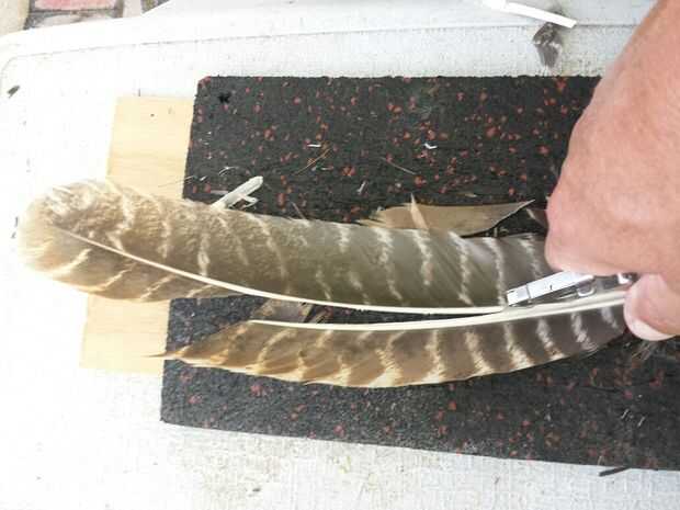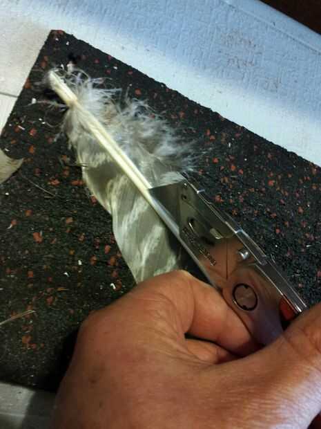 Comience por cortar por el medio del raquis de la pluma a lo largo. Hago una luz presionado "pre" cortar por la mitad la pluma alrededor del tirón y volver abajo el pre corte y corte a través de todo el camino. Este pre corte actúa como un guía y te ayudará desde corte de raquis prematuramente arruinando así una perfectamente buena pluma. Corte hacia abajo y hacia atrás hasta que tenga dos mitades iguales de la pluma. Recuerde después de la paleta.
