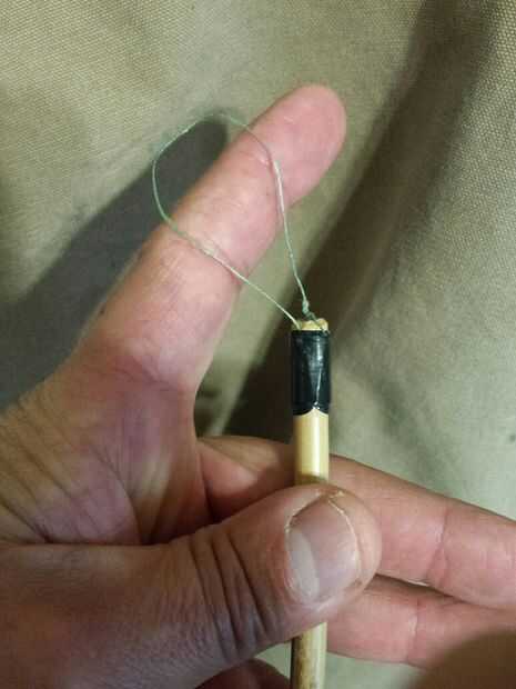 Una herramienta casera servicio. Esta es una herramienta que va a utilizar al servir de hilo en ambos extremos de la fletch y te evitará tener que hacer un nudo. Esta herramienta se hace fácilmente con la mano con un hilo fuerte (yo usé sedal trenzado para mi herramienta de servir). Un Consejo útil, el hilo de la herramienta de servicio debe estar muy cerca del mismo diámetro de la rosca que están sirviendo.
