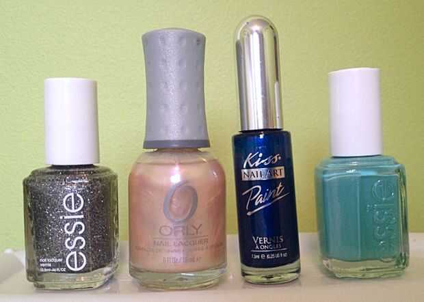 utilicé un ópalo de color base cuatro de mis uñas y un azul para el dedo anular con un brillo plateado en la parte superior y una flecha de color azul marina... se puede elegir cualquier color para las uñas.