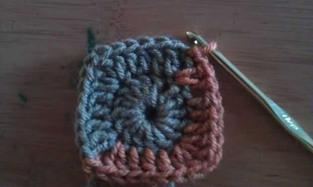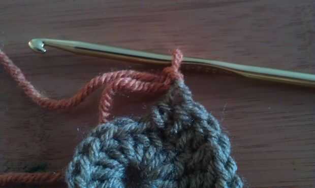 C.c. 1 en tres puntos de sutura, 2 ch 1 CC 2 en la siguiente puntada, dc 1 en siguiente 3 puntos. DC 2 en el mismo punto como el primer crochet doble del primer color, ch 1 y st sl la primera puntada.