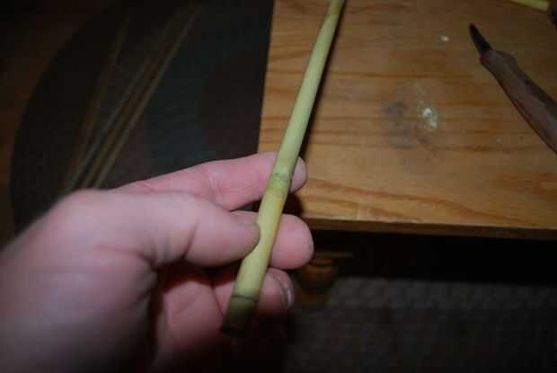 Los nodos son los pequeños anillos alrededor de las articulaciones del bambú o rivercane. Estos deben eliminarse para hacer el eje liso. Lo hago con un cuchillo pequeño muy afilado y ocasionalmente con el pequeño avión que se muestra arriba. Si esto te intimida, puede poner la lija en un bloque y suave con eso. El objetivo es tener un fuste liso que se deslice fuera de su mano. En este punto, creo que es una buena idea frotar el eje entero hacia abajo con una piedra de abraider fina o papel de lija fino de pelar la capa fina de piel de crecimiento nuevo. Sólo un poco. El eje de todo debe ser templado otra vez sobre una hornilla caliente para expulsar cualquier pedacito pasado del agua y endurecer las células.