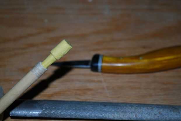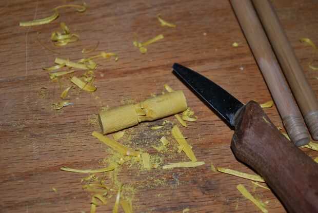 Estoy usando naranja de Osage (Maclura pomifera) aquí ya que es uno de mis bosques favoritos para cosas que necesitan ser resistentes. Sin embargo, funcionará cualquier madera de grano denso. Usando cualquier método que funcione para usted, tallar los insertos de nock en forma de taco un poco más grande que el eje de la flecha. Corte los nocks a una longitud uniforme y gradualmente lejos el diámetro necesario para encajar en el eje. Esto hará más fácil escaria los ejes con un pedacito de taladro, punzón o una herramienta similar. Una vez que haya un buen ajuste, poner un poco de pegamento sobre el inserto y casi listo con el nock.