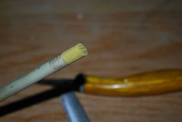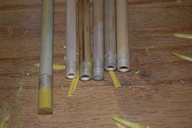 En este punto cortar a los ejes de mi final elegir un diámetro del eje conozco obras para mí (digo 5/16 a 3/8 de pulgada para sus primeras flechas). Es posible que observe que los ejes de la forma cónica de un extremo a otro. Ponga el extremo gordo hacia adelante (la parte que estaba más cerca del suelo cuando fue creciendo). La cuarta imagen muestra extremos nock reforzadas por el tendón un poco y ocultar pegamento. No es absolutamente necesario pero una buena idea para la fuerza máxima. No utilice tendón artificial para ello. Llevará a cabo no.