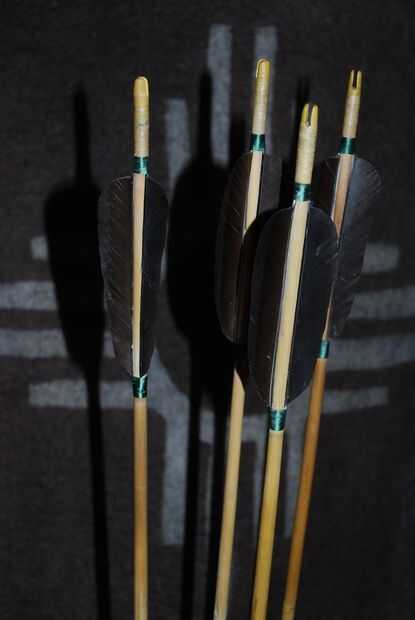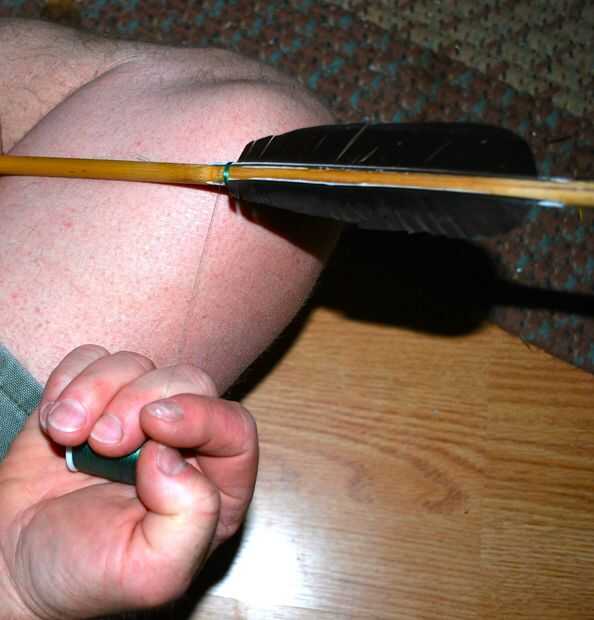 - ¿Donde exactamente colocar las plumas? Un error de amateur que he visto a menudo cuando la enseñanza no está dejando espacio en la parte trasera de la flecha. Una pulgada o más se necesitan aquí para los dedos. Así, para una pluma de 5 pulgadas, Mida hacia abajo el eje de siete pulgadas y haga una marca con lápiz. En esta marca, ate el hilo de seda en un ballestrinque y tomar un par de vueltas alrededor del eje. Esto sienta las bases para amarre abajo las plumas.