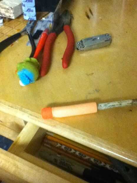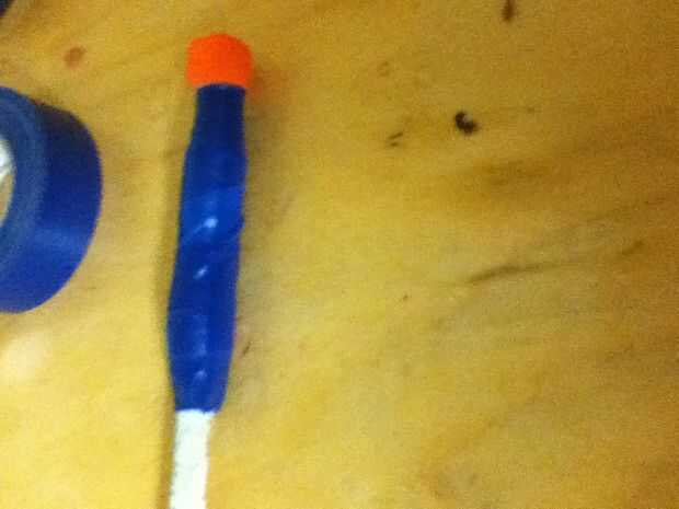 3 º: esto es opcional pero recomendado. Use cinta de pato o con cinta aislante para asegurar el dardo. Estoy usando azul y rojo (para los dos equipos)