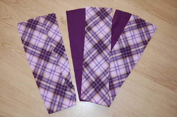 Usted tendrá que cortar 3 piezas de paño grueso y suave (un color sólido y dos con motivos) mide 50 pulgadas de largo por 6 pulgadas de ancho.