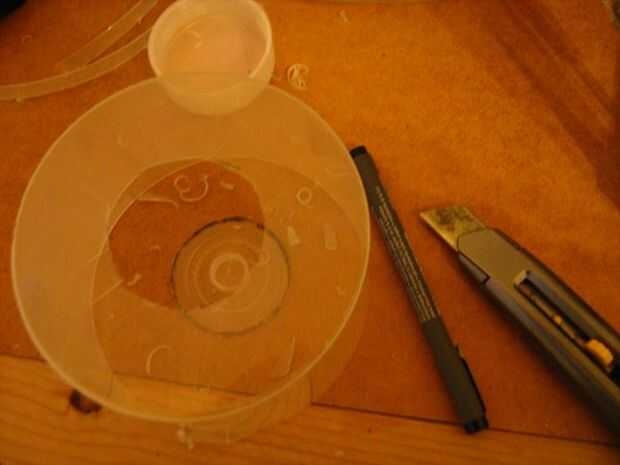 Cuidar su cortador y que no permitan que el plástico de la grieta demasiado, cortar el agujero. Se agrietará, es bastante rígido y fino, pero si trabajas cuidadosamente esto debe no se convirtió en tal problema que trozos de plástico se desprenderá . Debe este suceder, sin embargo, usted puede pegar hacia atrás, como esta estructura no tendrá que soportar ningún peso.