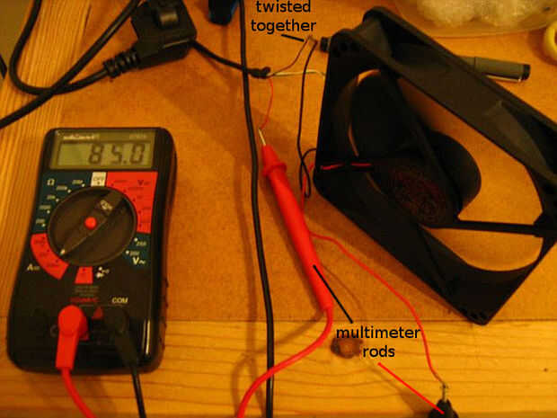 Normalmente, los ventiladores de PC tienen un muy bajo consumo de corriente, alcanzando un declarado 0,3 A, o 300 de la mina mA. Como nos estamos alimentando nuestro fan a través de USB, que ofrece sólo 5V contra los 12V necesarios, podemos estar seguros de que el consumo caerá bien debajo de la mitad de este valor. Un cargador de pared USB probablemente no tendrá ningún problema, y los puertos USB de cualquier PC tienen una salida teórica máxima de 500 (USB 2.0) o 900 mA (USB 3.0) cada una, por lo que podemos sentir razonablemente seguros; sin embargo, para aquellos que están preocupados, o sólo por curiosidad, vamos a tomar una medida (opcional).