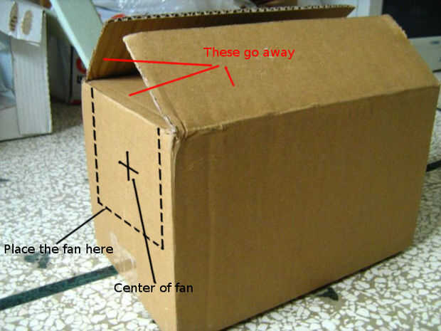 Vamos a empezar con la estructura. Retire las solapas superiores de la caja y coloque el ventilador contra uno de los rostros más pequeños (es decir, que a lo largo del eje longitudinal), centrándolo manteniendo la parte superior las fronteras Marque el centro del ventilador en la cartulina.