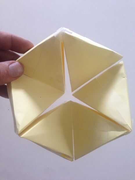 El objetivo es hacer seis tetraedros (un tetraherdon es un poliedro compuesto por cuatro caras triangulares, tres de los cuales se encuentran en cada esquina o vértice. Tiene seis aristas y cuatro vértices. Wikipedia) Los seis tetraedros se unirán luego la cinta adhesiva a las dos de cada uno de sus bordes como en la imagen de arriba.
