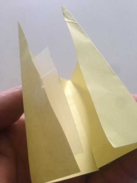 Corte un pedazo de dos pulgadas de la cinta Scotch y conecte con cuidado los bordes al lado de los dos dentro de triángulos escalenos para que tenga una costura cerrada que hace de los dos triángulos en un solo triángulo isósceles. Ahora tienes tres lados de su tetraedro.
