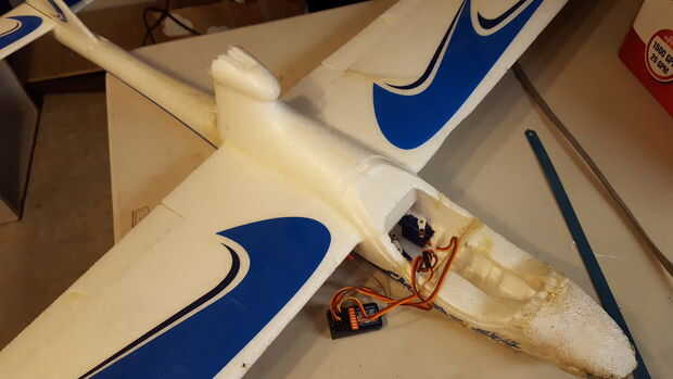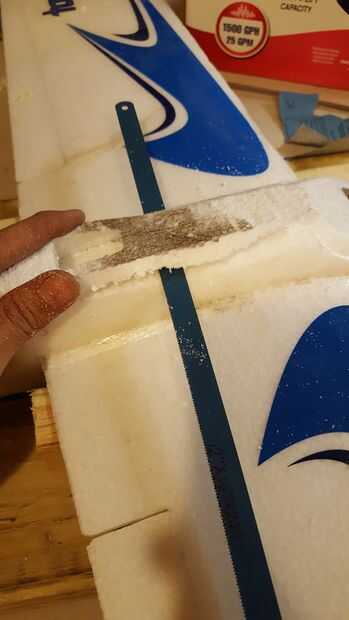 Saqué el motor en el avión entrenador dividiendo la bancada por la mitad y luego pegando la espuma detrás con pegamento seguro de espuma. Usé la hoja de una sierra para serrar con cuidado la parte superior del avión en una plataforma. Me aseguré que la plataforma es paralela a la mesa.
