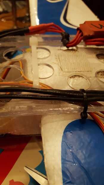 Aproximado donde iría el quad en el avión, dejando espacio para todos de hélices. Luego perforé 4 agujeros para grandes zipties ir a través, y aseguran que el cuádruple de la parte delantera y posterior del ala.