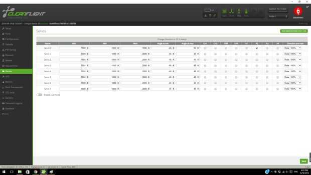 La siguiente foto muestra el ajuste de servos para él. Yo también he invertido mi canal Aux2 para mayor comodidad.