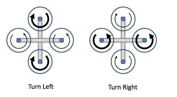 Por ejemplo: Si usted gire a la derecha, el CW motores de giro rápido. Con la orientación del spin motor correcto, usted puede conseguir los motores frente a flexión derecha y a izquierda de la flexión. Esto mejora significativamente la tasa de giro de lo quadcopter