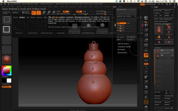 Importe el archivo OBJ en ZBrush. Se ha añadido un nivel de subdivisión a todo el modelo para hacerlo más suave. En ZPlugin utilice la subtool impresión 3D para guardarlo como un fichero .stl. Puede ser preferible para cambiar las dimensiones de pulgadas a milímetros para la impresión. Terminé de mina ajuste en 127mm, que es de 5 pulgadas, la altura que quería imprimir.