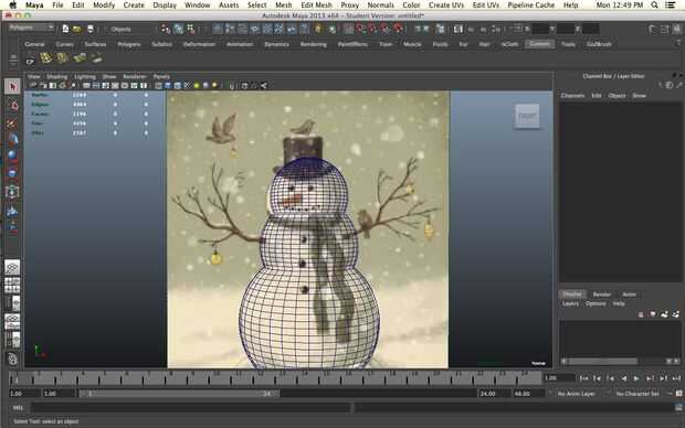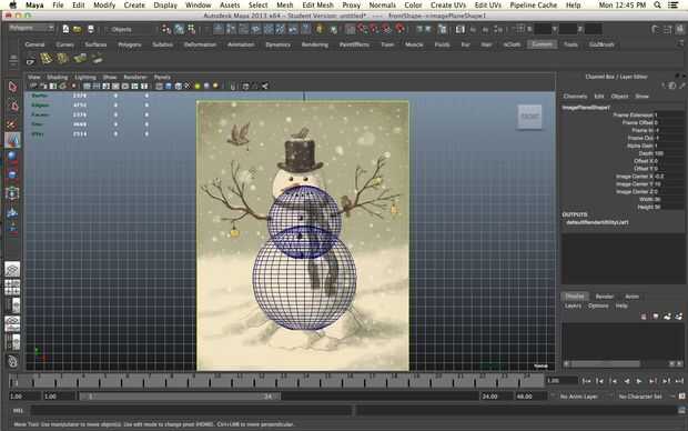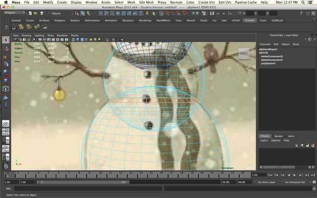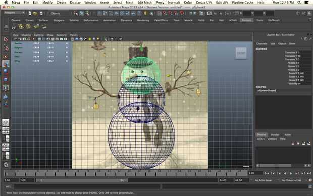 Primera posición centro del plano de imagen. Cambiar el tamaño de la esfera a la línea de arriba con la parte inferior del muñeco de nieve. Ahora duplicar la esfera y mover la línea para arriba con el torso del muñeco de nieve. Duplicar y cambiar el tamaño del torso. Se trata de la cabeza. Una vez que las esferas están en la posición y superposición entre sí eliminar los polígonos de cada esfera a donde queremos conocer porque vamos a combinar en un objeto.