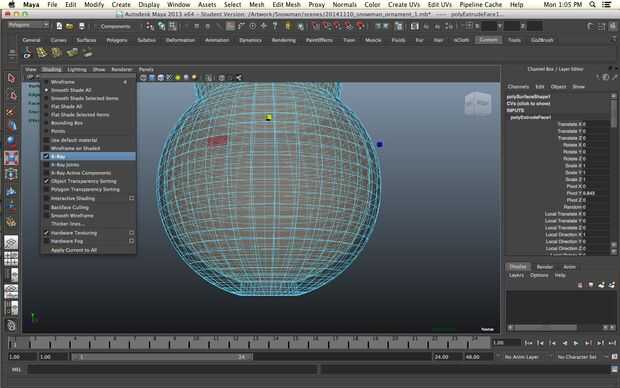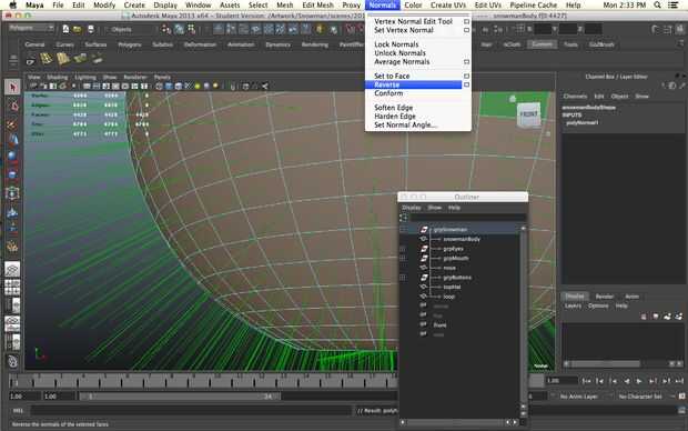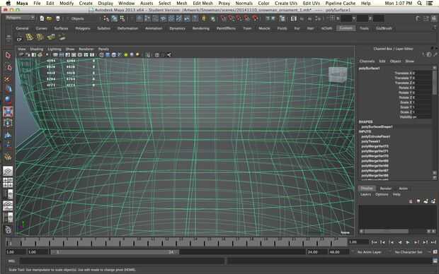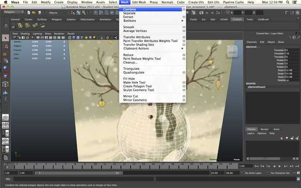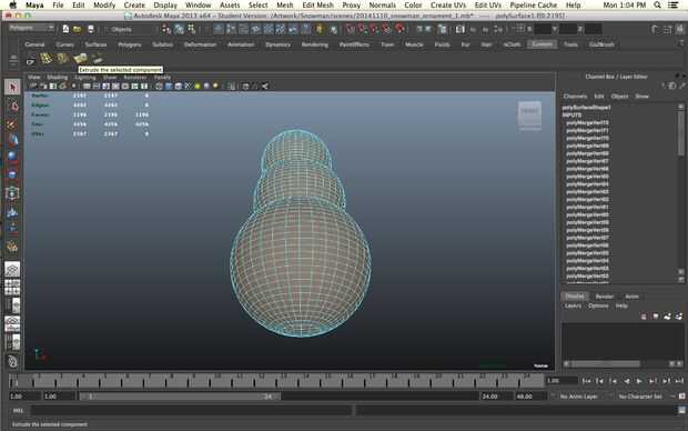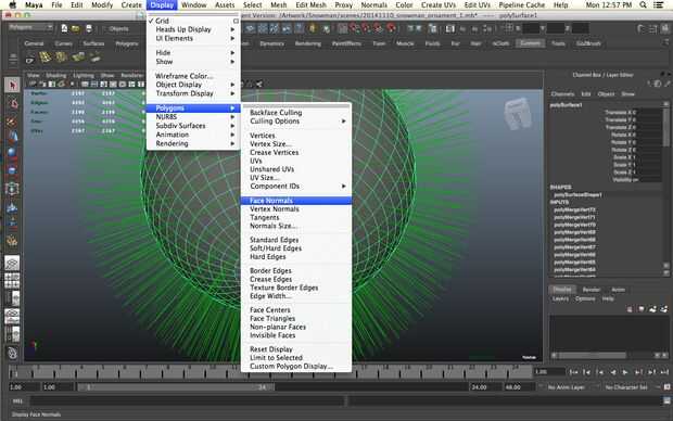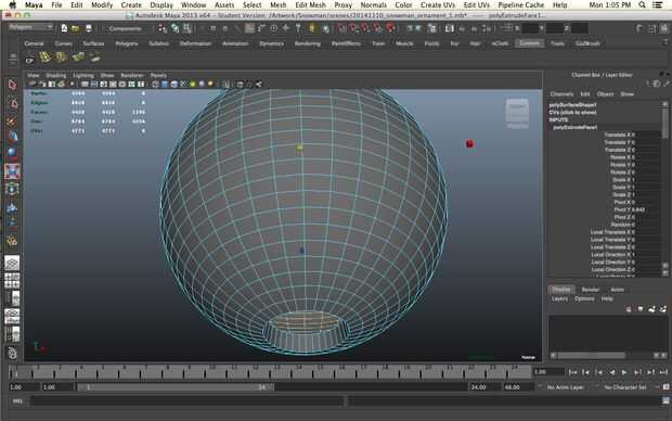 Cuando los verdes se combinan juntos Asegúrese de salir del agujero en la parte inferior del modelo abierto. Seleccione la cara y extrusión en. Ahora tendrás un hueco modelo con un agujero para una luz de la Navidad y ha creado una malla impermeable. Recuerde revisar sus normales. Yo olvidé y tuve que invertir mi normales más tarde.
