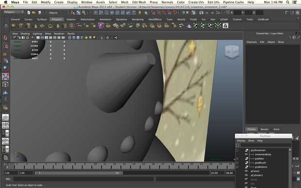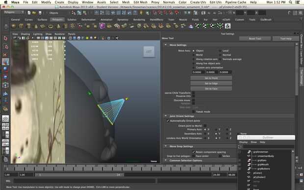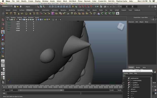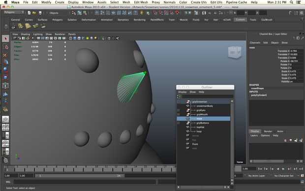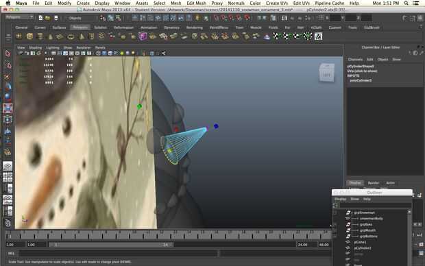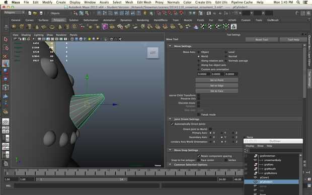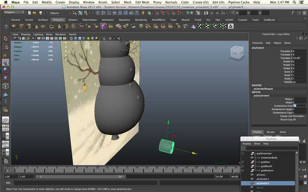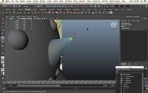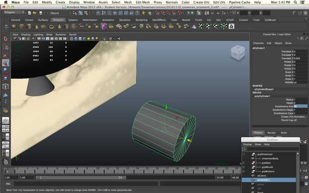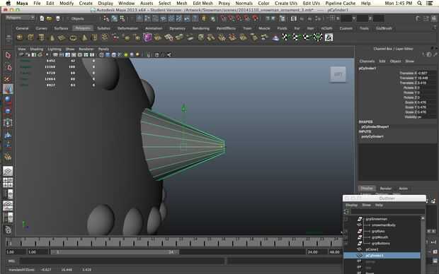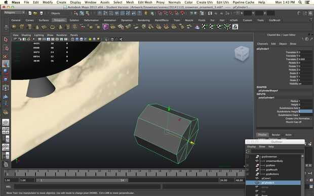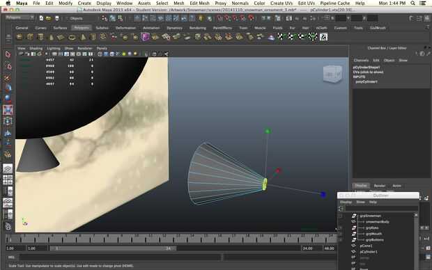 Un muñeco de nieve sin una nariz es una cosa triste de hecho pero todavía queremos imprimir sin apoyo. No queremos a realmente a un solo punto ya no imprima bien vamos a empezar con un cilindro. Disminuir los niveles de subdivisión de altura de 30 a 1 y aumentar los niveles de subdivisión de eje de 8 a 20 para darle más redondez. Seleccionar los vértices en un extremo del cilindro y la escala camino abajo.