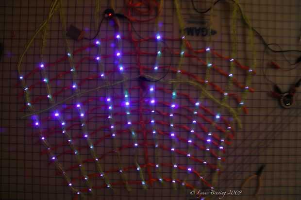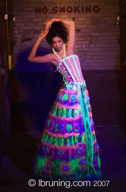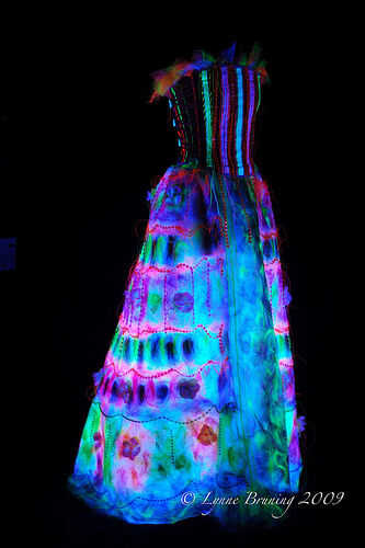 usé este método eTextile para crear un sistema de iluminación de LED UV dentro de un bullicio de langosta para vestido de noche de la Señora Mary Atkins-Holls.
