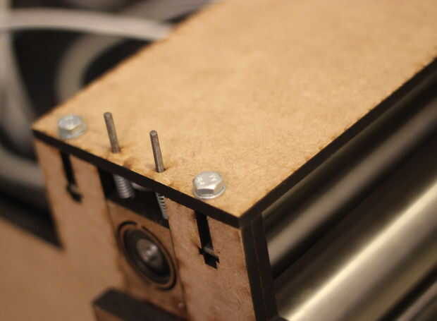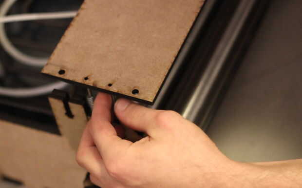 Coge tu última 4 pernos, tuercas cuadradas y arandelas (todos ellos M6) y fije la placa de techo a las placas laterales.