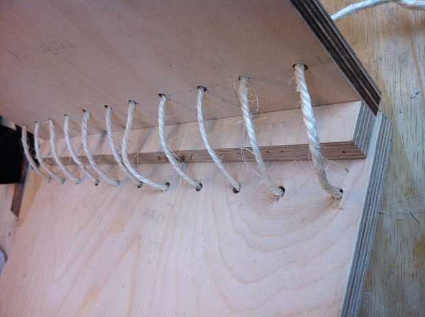 Tejido de la cuerda entre las piezas de madera más gruesa mediante el uso de la puntada de silla de montar. Esta técnica asegurará la firmeza adecuada.