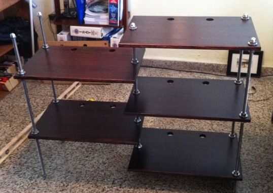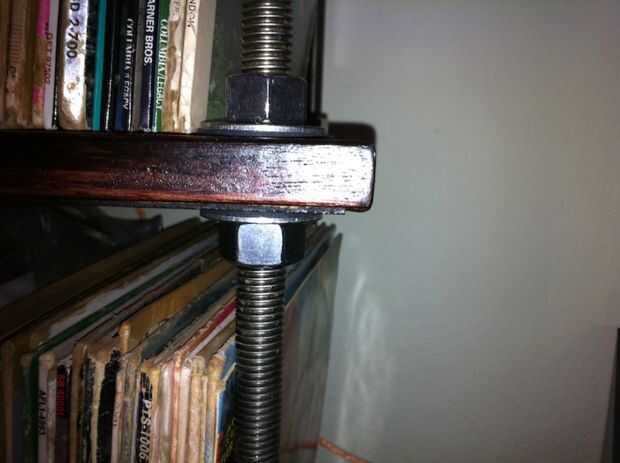 9) Nota que usé tuercas bellota para la plataforma más alta a la derecha para conseguir un aspecto más acabado. Usted puede cortar el otro tornillo que se pega fuera del estante superior de la otra parte y terminar con tuercas bellota. Yo no he hecho porque estoy esperando un amplificador diferente que tengo, y quiero que la ajustabilidad.