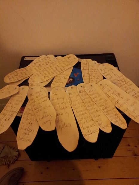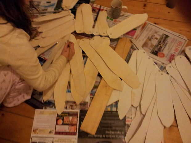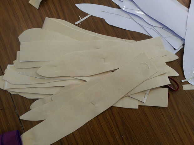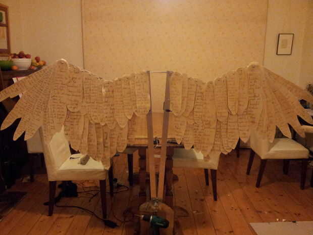 La caligrafía se hace a mano y se toman las palabras de algunas de mis novelas favoritas. Aquí hay un enlace a la lista completa de citas: http://studio-arts-2013-digital-folio.tumblr.com/post/65027924790/the-list-of-quotes-i-wrote-on-my-wings-artwork