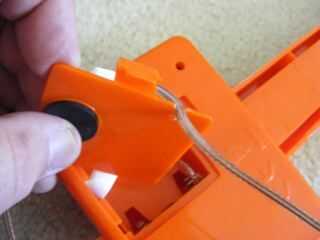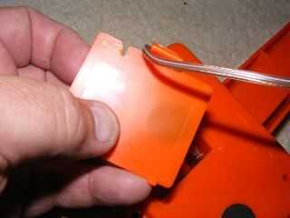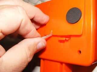Me daba pereza ir al sótano de un archivo, no quería molestar con mi navaja suiza, usé una lima de uñas que mi esposa dejó tendido alrededor. Simplemente corte una muesca. Si es ajustado, sería bueno. Así, no permite cualquier tirando de los cables desde el exterior. Que puede hacer que los cables para despegarse el resortes - y kitty querría!