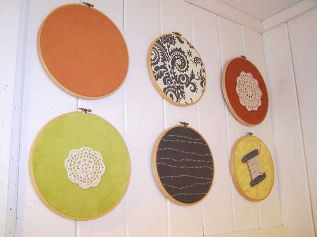 Marco algunas selecciones de tela colorida en aros de bordado para añadir color.