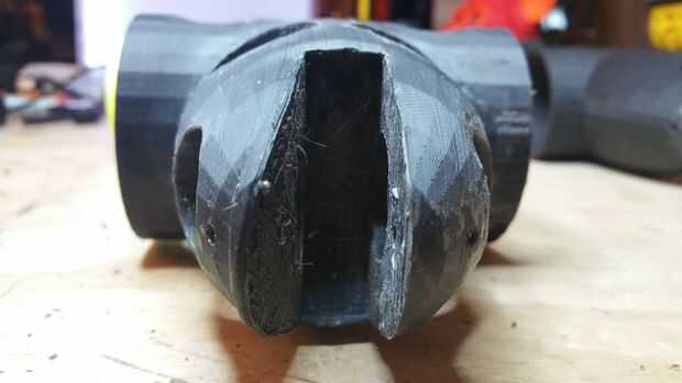 El cuerpo se compone de 3 piezas estampadas 3D: el cuerpo principal y dos tapones. El cuerpo es cilíndrico en forma de un soporte adjunto del centro de la rueda estabilizadora. Tiene un aspecto de queso suizo para ahorrar material y tiempo de impresión y para poder ver los LEDs a bordo del BlueSMiRF cuando el bot. Las tapas son cono una forma con una cavidad dentro del motor y con agujeros en el extremo de los tornillos de montaje. Las dimensiones del final son tales que se pulse ajustan sobre los extremos del cuerpo y no necesita ningún pegamento o tornillos para mantener allí.