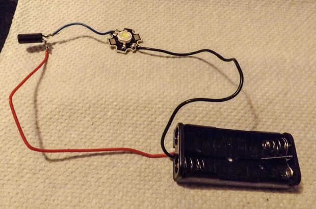Cualquier persona con experiencia en el uso de LEDs puede haber notado una falta de uso de la resistencia. Normalmente nunca sueño con correr un LED directamente en una batería. Sin embargo, estos 1 vatio LED son mucho más poderosa que su LED estándar y dibujará sobre 350mA su máximo nivel de performance que requiere 3.3 - 3.5V para hacerlo. Por bajo-driving les en 3V que dibujar acerca de 200mA y siguen siendo bastante brillantes.
