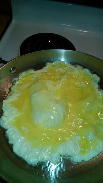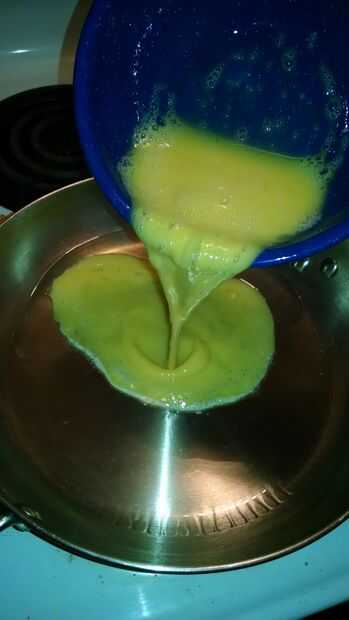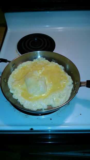 Cuando sus vegetales y la carne esté lista Agregar los huevos vertiéndolos en una corriente continua (no debe ser confundido con un goteo) agitando suavemente el aceite, meciendo el pan en un círculo constante. Usted verá los huevos absorben el aceite y empezar a deslizarse sobre. Si los huevos se pegan en todo significa que establece a la temperatura demasiado alta. Deje que cocine mientras balanceo de vez en cuando hasta que los huevos son sólo ligeramente crudos en la parte superior.