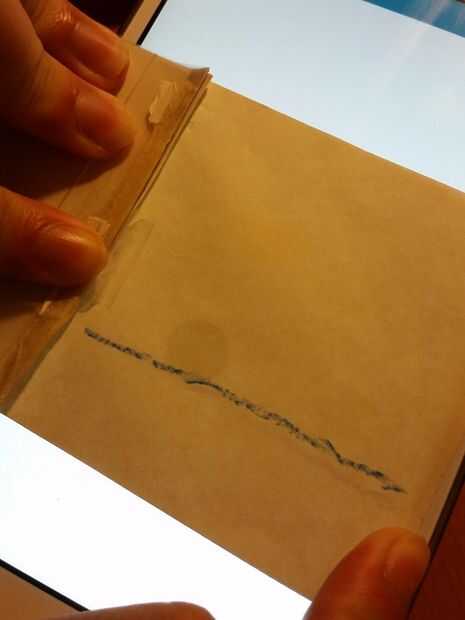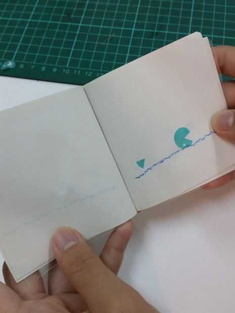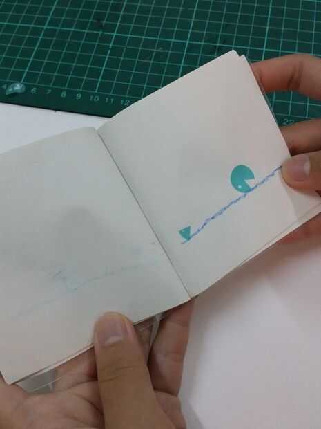 Preparamos un pequeño cuaderno para servir como nuestro libro animado. El papel que estaba lo suficientemente delgado como para ser visto a través de mediante el uso de una mesa de luz, aunque saldría que la delgadez nos dio dificultad en las páginas de los bancos sin problemas al final. Utilizando una pantalla de teléfono móvil como una pequeña mesa de luz, primero trazó una línea de tierra en lápices de colores en cada página que íbamos a utilizar. Luego nos pegan los dos caracteres en la página, cuidando de rotar y cambiar la posición de carácter circular como él a lo largo de.